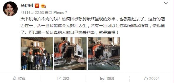 4月中旬的时候,马伊琍在微博晒幸福,称“活一世却能体会无数种人生,若有一种可以让你瞬间倾尽所有,便也值了。可以跟一帮认真的人做自己热爱的事,就是幸福!”