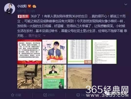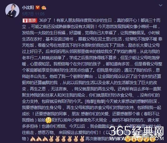 同样小沈阳儿前两天也是过生日在微博发了一大段文字,感谢师傅感谢妻子感谢女儿。