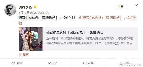 导演李杨在微博转发了一条“杨幂们拿这种‘国际影后’丢谁的脸”的文章,结果,被杨幂的粉丝们找上门来怼了!