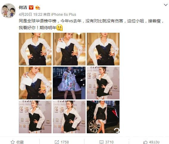 但是何洁还是从160暴瘦到100斤、就连她自己都在微博上感叹:同是全球华语榜中榜,今年vs去年,没有对比就没有伤害,这位小姐,接着瘦,我看好你!期待明年。