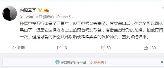 5月12日,陶阳在微博发文称:“孙悟空在五行山呆了五百年,终于把师父等来了。其实崩山后,孙完全可以回花果山了,但是它选择老老实实的跟着师父取经,唐僧当然计孙的前嫌。怕他再闹一次,但是可爱的悟空从此以后便踏踏实实的保护师父,直到取经归来”。