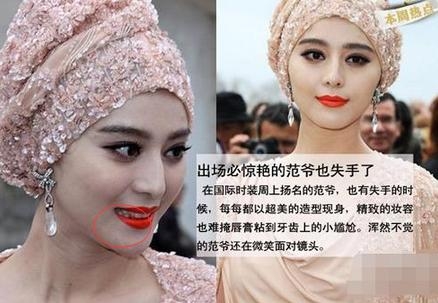 冰冰算是女神级的人物了吧,一颦一笑,都能吸引无数男人为她着魔。但范冰冰失算的事情还真不少,从之前被拍到胳膊粗装,衣服扣崩开外,还有不少被拍到口红被沾到牙齿上面的时刻。