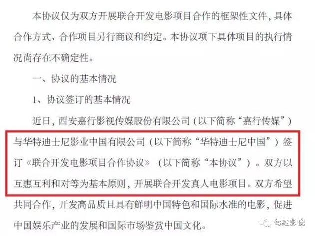 嘉行传媒关于与华特迪士尼影业中国签订联合开发电影项目合作协议的公告
