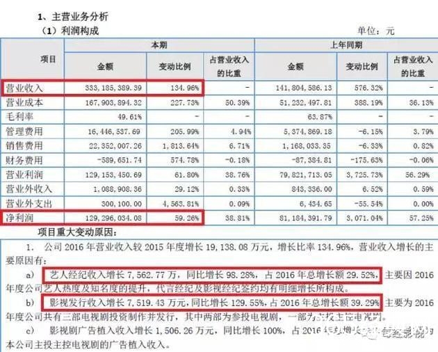 据嘉行传媒2016年年报,公司2016年营收3.3亿元,较去年同期增长134.9%,净利润为1.3亿元,同比增长59.3%。值得注意的是,嘉行传媒2016年的营收增长额,70%左右来自艺人经纪与影视剧发行。其中,艺人经纪收入增长7562.8万元,占2016年总增长额的29.5%,影视发行收入增长7519.4万元 ,占2016年总增长额的39.3%。