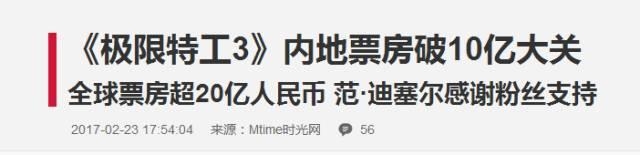 《极限特工3:终极回归》上映当天票房破亿,