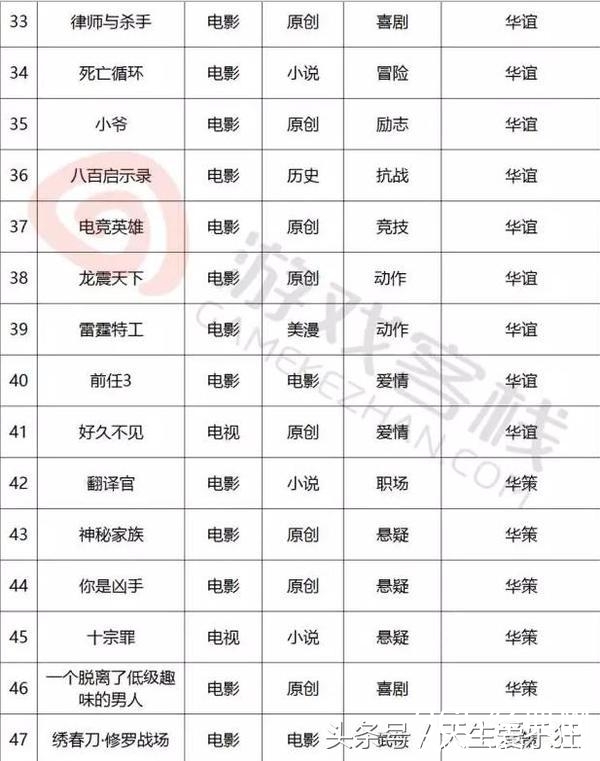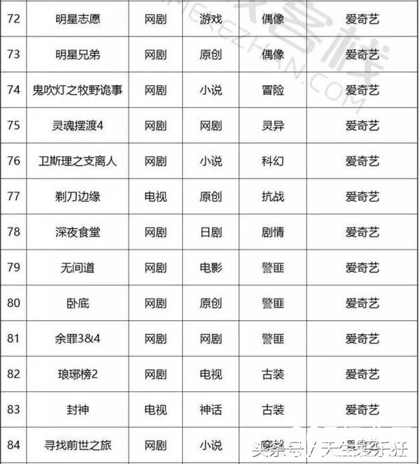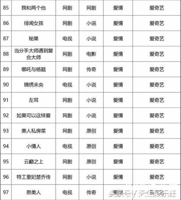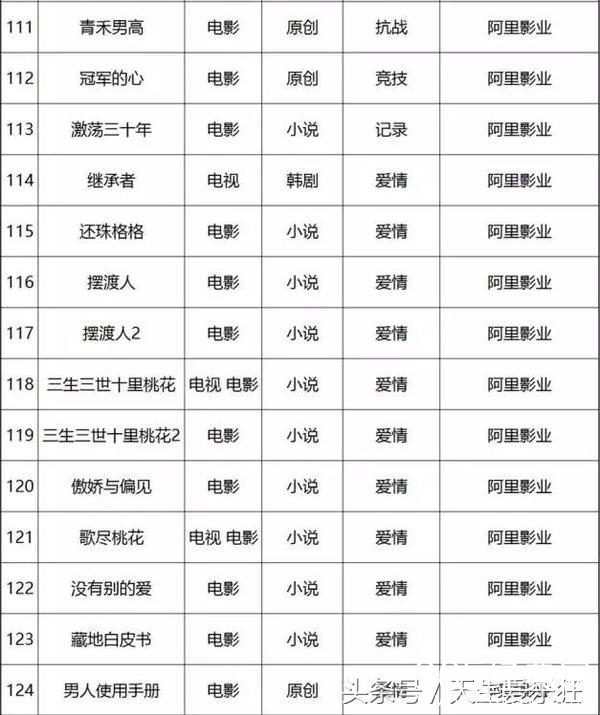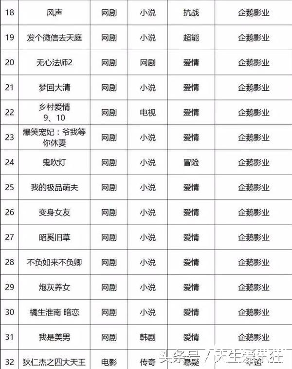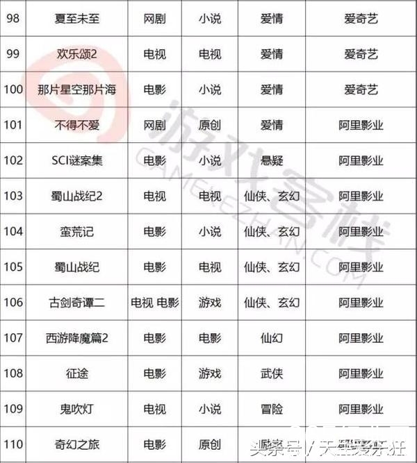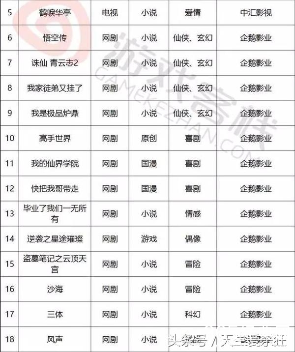 电视剧类:11处特工皇妃,如懿传,如果蜗牛有爱情,美人为馅,且试天下,蔓蔓青萝,斗破苍穹,十年一品温如言,凉生我们可不可以不忧伤,木槿花西月锦绣,东宫,醉玲珑,爱情的开关,全职高手,温暖的弦,孤芳不自赏,纨绔世子妃,不负如来不负卿,那些回不去的年少时光,生园,非我倾城,王爷要休妃,路从今夜白,跨过千年来爱你,原来你还在这里,我在回忆里等你,诛仙青云志,凤求凰,爵迹,何处冬暖何处夏凉,庆余年,京门风月,致我们单纯的小美好,长歌行,鬼吹灯,别那么骄傲,轩辕剑之汉之云,明星志愿,天下之倚剑听雨,烈火如歌,美人谋律,皇后出墙记,九州天空城,斗破苍穹,择天记,大富翁,莽荒纪,扶摇皇后,簪中录,一路繁花相送,那片星空那片海,搜神记,寻找前世之旅,锦绣未央,兰陵缭乱,长相思,曾许诺,无心法师2,岁月忽已暮,亿万老婆买一送一,他来了,请闭眼2,落花时节又逢君,亲爱的阿基米德,亲爱的苏格拉底,爱你是我做过最好的事,回到明朝当王爷,寻找爱情的邹小姐,极品家丁,那些不为人知的故事,南方有乔木,仙剑奇侠传5,吉祥纹莲花楼,江南恨,夜上海,龙樱,七根凶简,暗恋橘生淮南,黑白无双,虎鹤,火王