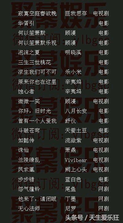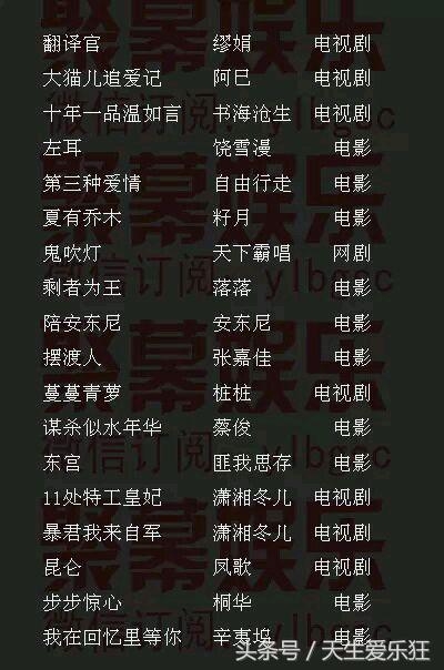 电影类:翻译官,三生三世十里桃花,微微一笑很倾城,华胥引,杉杉来吃,伪装者,镜双城,华胥引,花千骨,良言写意,最美遇见你,七月与安生,沙漏,曾有一个人爱我如生命,东宫,星光璀璨,夏有乔木雅望天堂,那些回不去的年少时光