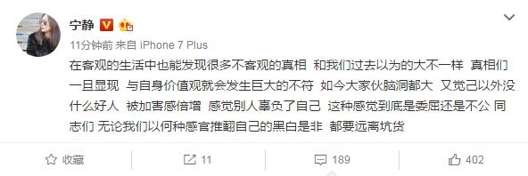 14日,针对这个事件,宁静再发文回应,称“生活中也有很多不客观的真相”,还说无论我们以何种感官推翻自己的黑白是非,都有远离坑货。