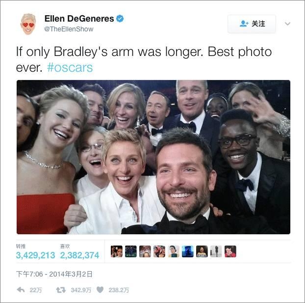 第一次是在2014年奥斯卡颁奖典礼,主持人Ellen用三星手机,和众明星来了一次史上“最牛自拍”,并将其传上了Twitter。