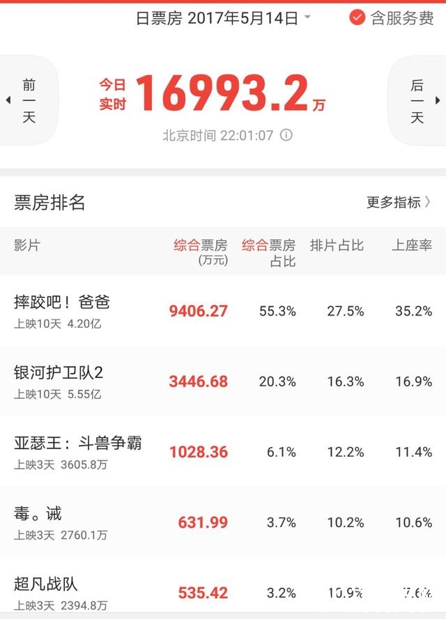 本周末上映的其他几部影片表现平平,截至5月14日22点,《亚瑟王:斗兽争霸》当天拿下1028万元,首周末三天累计3605万元;《毒。诫》632万元,三天累计2760万元;《超凡战队》535.4万元,三天累计2395万元;《麻烦家族》474.8万元,四天累计2628.5万元;小成本国产喜剧《提着心,吊着胆》244万元,三天累计996万元。