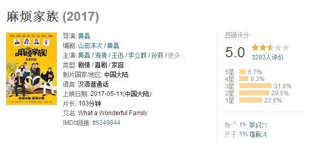 《麻烦家族》豆瓣评分5.0,不及格。黄老师你可是文艺青年啊!电影学院的老师,一直是娱乐圈才华横溢的代表。
