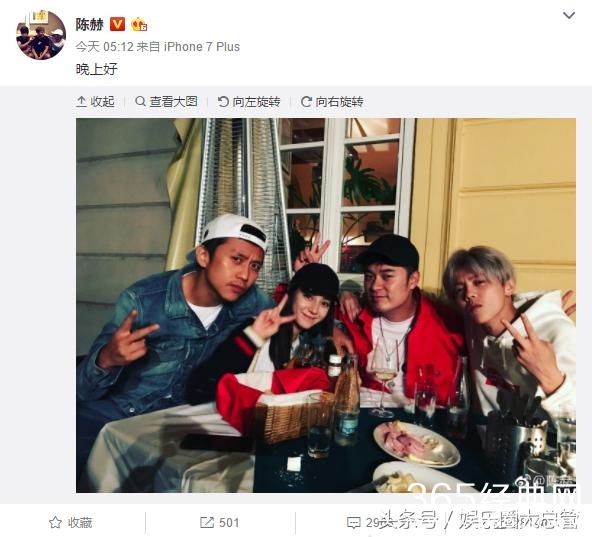 今天凌晨五点多,陈赫又发了一张跑男合照,这次只有邓超、迪丽热巴、陈赫和鹿晗。很明显这是为了补给迪丽热巴的粉丝的,陈赫这人也太耿直了吧。他说“晚上好”,应该捷克那边是晚上了,其他几位成员刚到,几个人聚个餐拍个照发个微博。