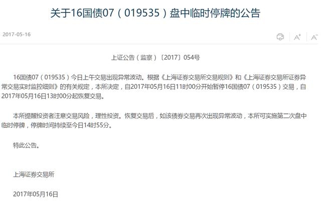 上交所在公告中表示,自2017年05月16日11时00分开始暂停16国债07(019535)交易,自2017年05月16日13时00分起恢复交易。恢复交易后,如该债券交易再次出现异常波动,本所可实施第二次盘中临时停牌,停牌时间持续至今日14时55分。