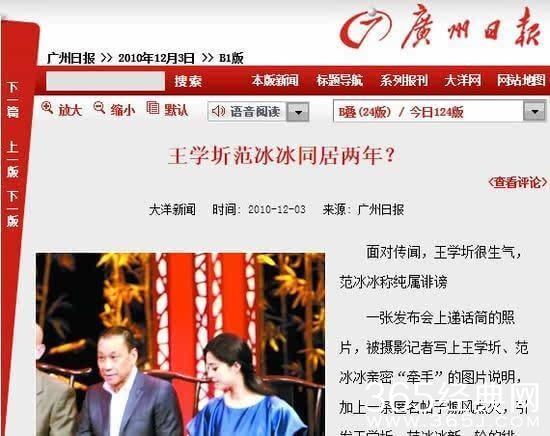 后来在二人合作《赵氏孤儿》的时候,二人的绯闻愈演愈烈,甚至有媒体报道当年王学圻和40年的发妻离婚也是因为范冰冰,但是后来王学圻离婚后,并没有娶范冰冰。