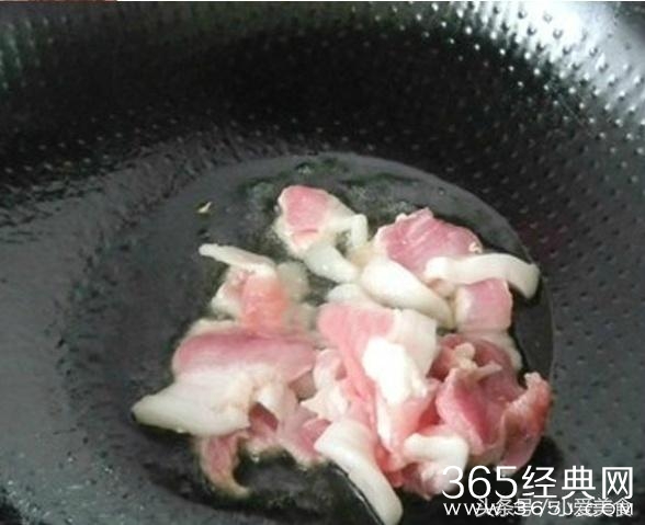 3,热锅冷油放入五花肉小火煸炒,直至刚呈透明状。
