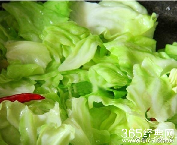 5,开大火,放入沥干水分的包菜、干辣椒继续煸炒。