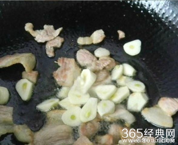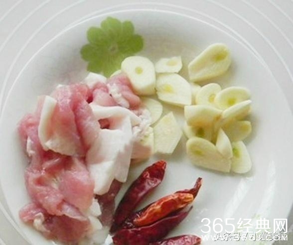 2,五花肉去皮切薄片,蒜也切片,干辣椒洗净剪成两半。