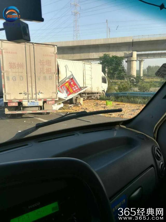 今早6点30分左右,车友江先生向河南交通广播爆料:连霍高速 东向西 距离东三环北站300米左右,两辆拉食品的箱货发生碰撞,其中一辆车横在路上。