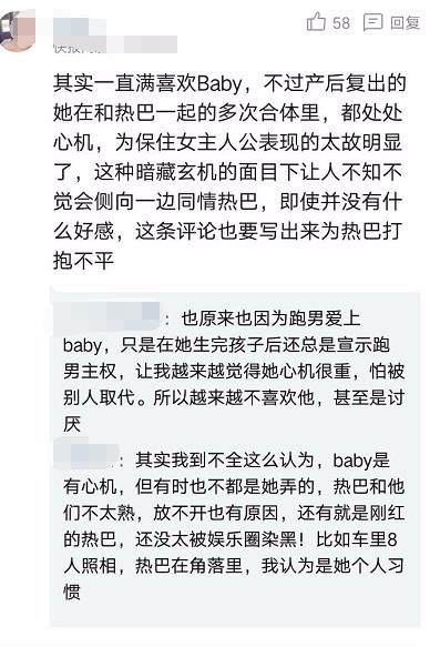 不过,也有网友表示:不一定是baby有心机,热巴作为新加入跑男的成员,她与baby相比和跑男兄弟团各位成员肯定不是很熟,所以难免有些放不开。还有就是躲在角落里拍照可能是热巴的个人习惯,真的和baby无关。