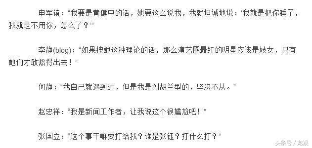 通过两位明星的回答,我们可以解答出以下信息:第一,这是普遍现象,于是后继者也就不足为怪,跟风效法,反正又不是我一个人。第二:被潜的女演员是自愿的,没人逼迫,是他们自己为了上位出名。第三:被著名导演潜规则是一种光荣。