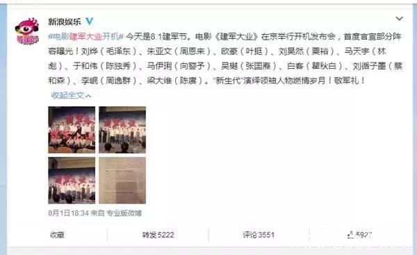 话又话说回来,如今这个时代,娱乐为王,颜值即正义,像《建军大业》这种严肃题材的电影,走颜值路线也未尝不可(当然演技不要浮夸)。毕竟当年的革命先辈,都是风华正茂的青年。正如该片的监制所说,“我们将诠释意气风发的年轻革命先辈的任务,交给同样青春年华的青年演员来完成。”