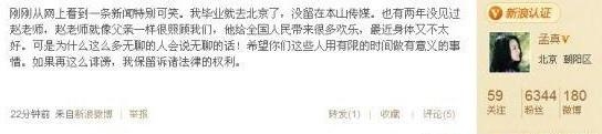 该条爆料瞬间在网络广泛流传,孟真也被推向了风口浪尖,于是她马上做出回应,在自己的微博发出公开声明,表示赵本山一直都向父亲一样照顾自己,更是给观众带来那么多欢乐,不知道为何要诋毁他,自己大学毕业后去了北京,不在本山传媒,并严重警告了诽谤者,保留诉诸法律的权利。