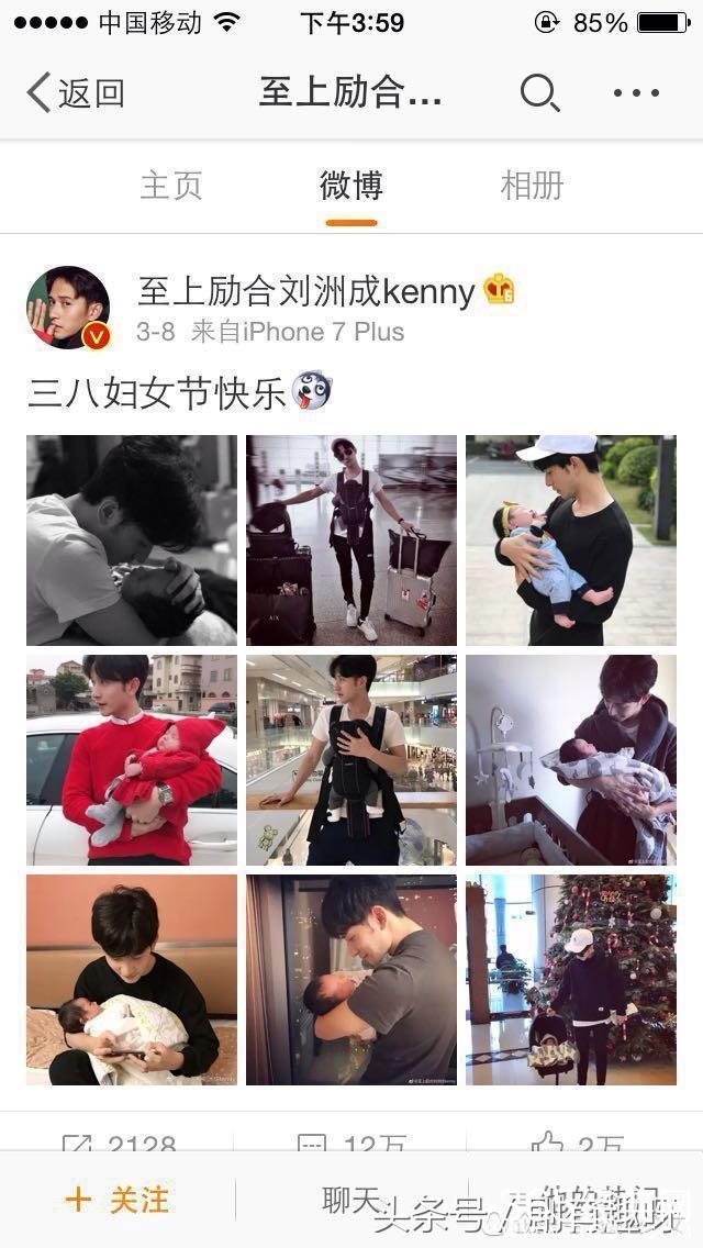 置顶的一条微博是3月8日发的,庆祝妇女节。顺便还发了九张自己带娃的照片,在家带,在商场带,在公园带,在机场带,带再多行李也要带娃!差点我都信了!这简直就是被妻子和孩子“压迫”的三好男人啊?!大家也来感受一下!