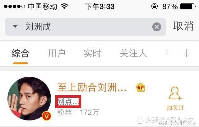 搜索“刘洲成”以后,他的微博显示出来。简介栏里赫然写着“别点...”,我到底是点还是不点?这让我也很无奈啊!