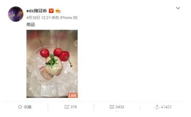 陈冠希在微博上晒出自己的甜点,照片中两三颗草莓和几个殷桃,还配文说“高级”。