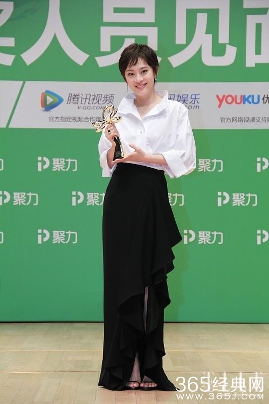 上海电视节白玉兰奖二度封后时的造型也选择了高腰款。她身穿CH by Carolina Herrera 2016秋冬系列白衬衫,下搭黑色不规则剪裁荷叶边开叉半身裙,简约的黑白配衬衫长裙,拉长曲线的同时也尽显孙俪的干练风格。