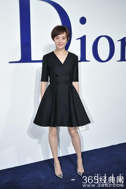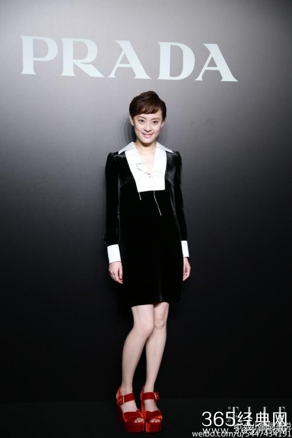 亮相品牌活动,Prada黑白拼色天鹅绒小V领小礼服,裙长不过膝,对于娇小的孙俪来说这是最合适的长度。