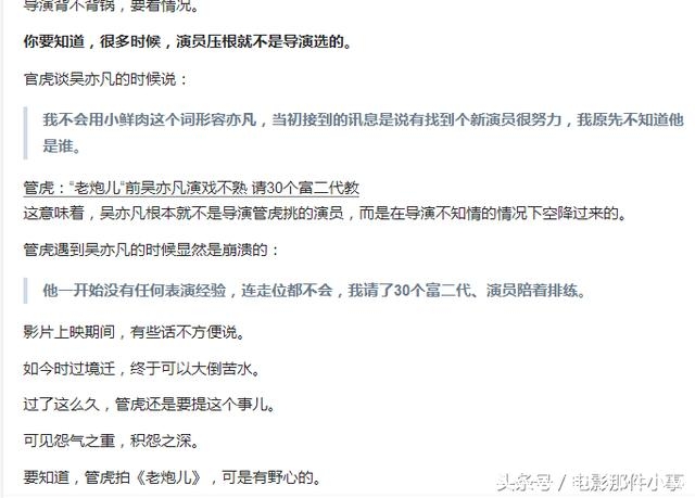据导演管虎称,老炮儿中由吴亦凡饰演的富二代其实一开始并没有选择由吴亦凡来饰演,但因不可明说的原因,吴亦凡空降剧组。