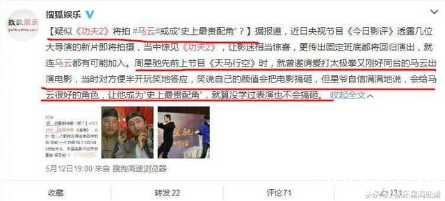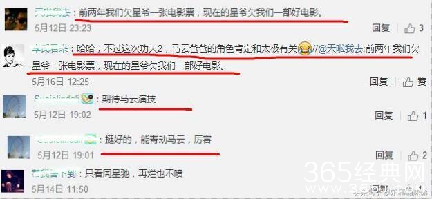 网友评论:前两年我们欠星爷一张电影票,现在的星爷欠我们一部好电影。不过这次功夫2,马云的角色肯定和太极有关。期待马云的演技。