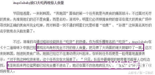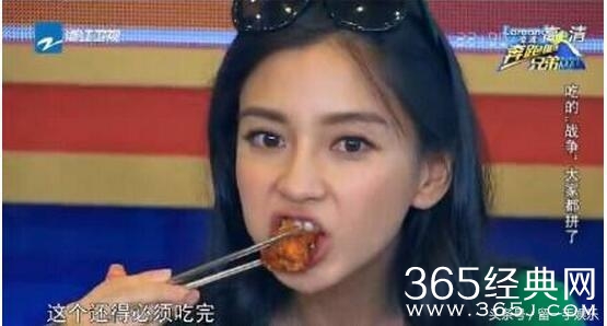 杨颖也被节目组塑造了吃货的形象,说她在《十二道锋味》展现了与身形不相符的“惊人”食量还把谢霆锋吓一跳……这是得有都能吃啊!还有在韩国的美食广场,节目组说邓超等猛男完全吃不下去了,但是杨颖还在面不改色的“狂”吃……并用“生猛”形容杨颖的食量,这……