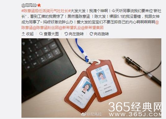 爆料员工在微博里写到:“今天听同事说我们要来位‘新社长’,看到工牌的我震惊了,居然是陈意涵!陈大发!裸眼5.1的我没看错,我跟女神成为同事了~”。而“陈大发”正是粉丝对陈意涵的昵称。