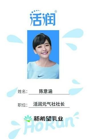 从爆料图片中可以看出,工牌所属的企业是国内城市型乳企巨头新希望乳业。被标注为“活润元气社社长——陈意涵”的女子几乎不施粉黛,素颜出镜。通过照片记者还是轻易地分辨出,这位气质可爱的圆脸少女正是出演过《痞子英雄》、《听说》、《闺蜜1》等系列作品的知名女星陈意涵。