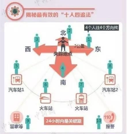 之所以这样做,是因为有时候歹徒把小孩抱走后,他会火速赶往火车站、汽车站,买张票马上就上车,所以我们要争时间抢速度,如果能比他快,就能把他截住。曾经有这样的真实案例,就是母亲刚丢了孩子之后,马上组织人,分头追赶。结果一到火车站,犯罪分子正检票呢,一把就把他揪了回来。“十人四追法”中,除了8个人,另外2个人做什么呢?一个去报警,一个人要留在家里。因为有的时候,小孩子自己能够找到家。