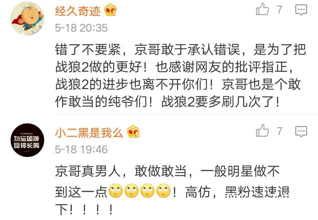 网友们对吴京知错就改、敢作敢当的态度点赞,纷纷表示支持吴京,支持京哥的电影。