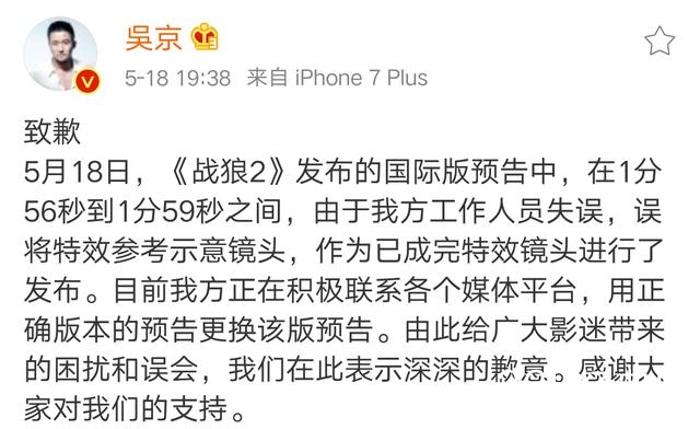 原来是因为工作人员的失误,误将特效参考示意镜头作为已完成特效镜头进行了发布,吴京专门致歉,且表示正在积极联系各媒体平台,用正确版本更换预告。