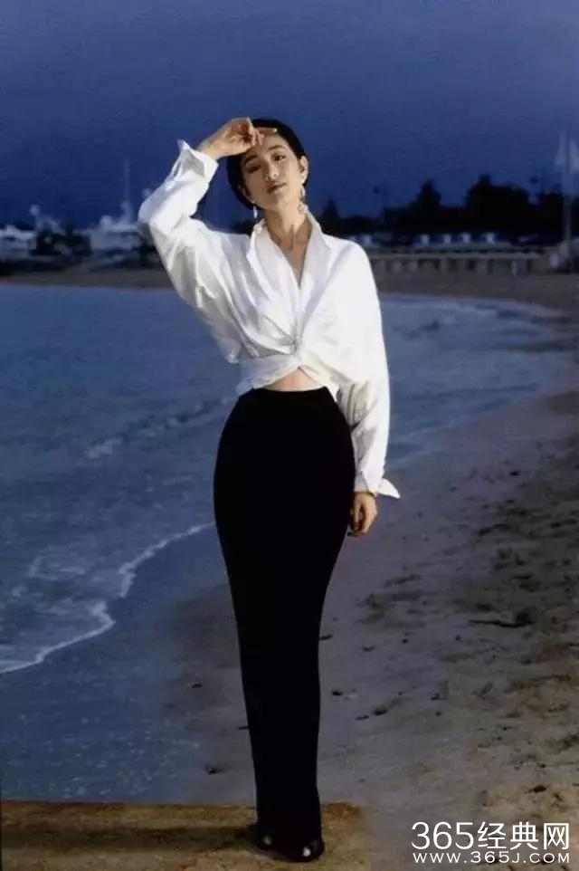 国内女星中,最经典的莫过于巩俐这身,1993年她第一次参加戛纳电影节,白衬衫搭配黑色裹身长裙,站在海边,女神啊。▼