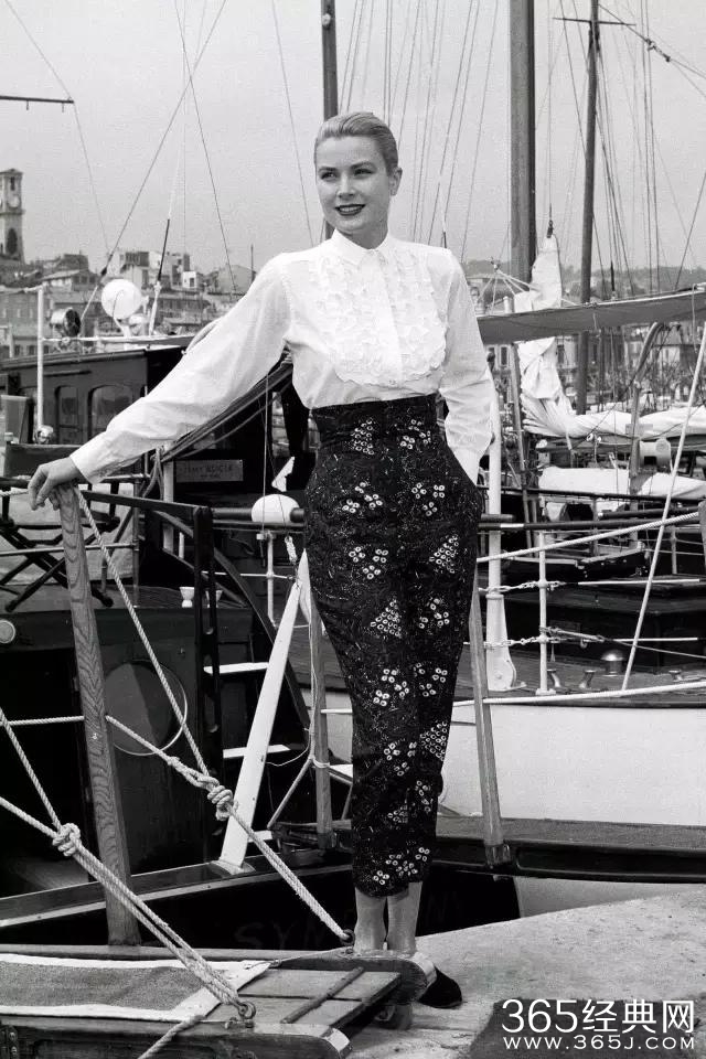 1955年的戛纳电影节上 ,26岁的Grace kelly身穿白色宫廷风衬衫,搭配上蕾丝高腰七分裤,随性又优雅。▼