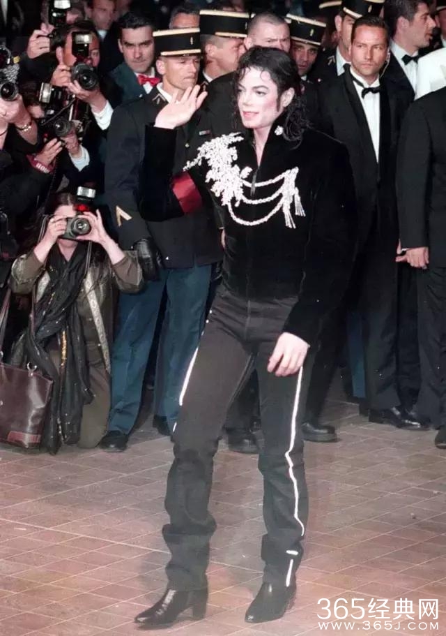 1997年,迈克尔·杰克逊的音乐录影带《鬼怪》举行首映式,他穿了一件军装风上衣和一条会发光的裤子走红毯,成为他的经典造型之一,至今看来依然时髦到不行。▼