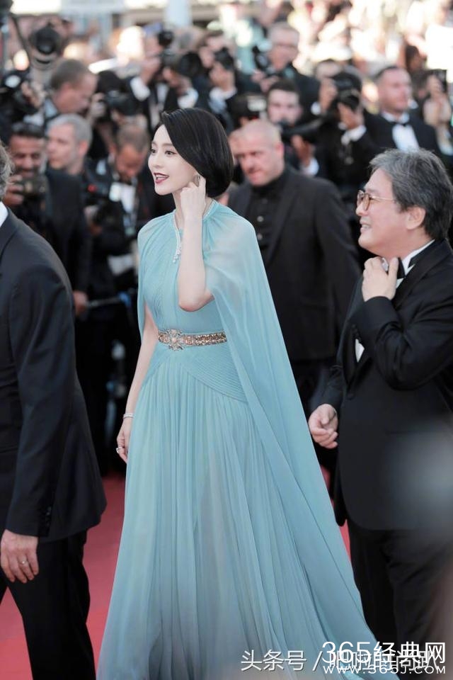 范冰冰穿了一件水湖蓝色的长礼服,颜色非常特别,薄纱的设计仙气十足,尤其是这件礼服独特的薄纱披风式设计,穿起来女神范儿十足!
