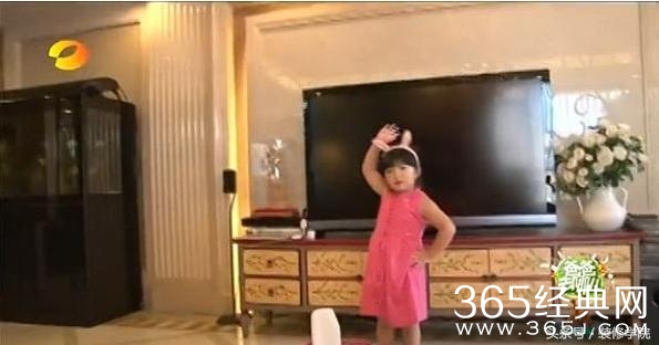 王诗龄站在电视柜前跳舞。电视柜上雕刻着精美的花纹,上面摆了一台超大尺寸的液晶电视。电视背景墙没有过多的装饰,只是在周围雕刻一些竖直的条纹。
