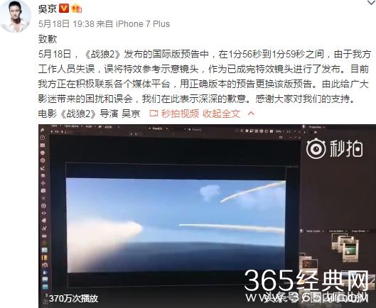 《战狼2》命途多舛啊,好不容易发预告片了,却因为工作人员失误,发成特效镜头了。导演吴京也在第一时间发博致歉。