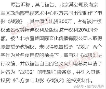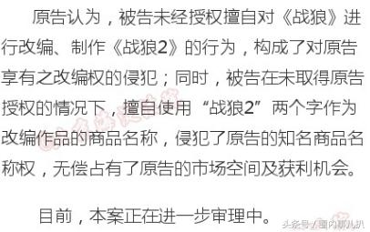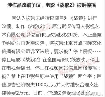 刚举行完发布会,今天却接到法院的通知说因认为《战狼2》未经授权,擅自对《战狼》进行改编、制作而成,武汉传奇人影视艺术有限公司诉至法院,要求停止电影《战狼2》在全国电影院线放映、禁止在电影名称中使用“战狼”二字;赔偿经济损失1000万元等。