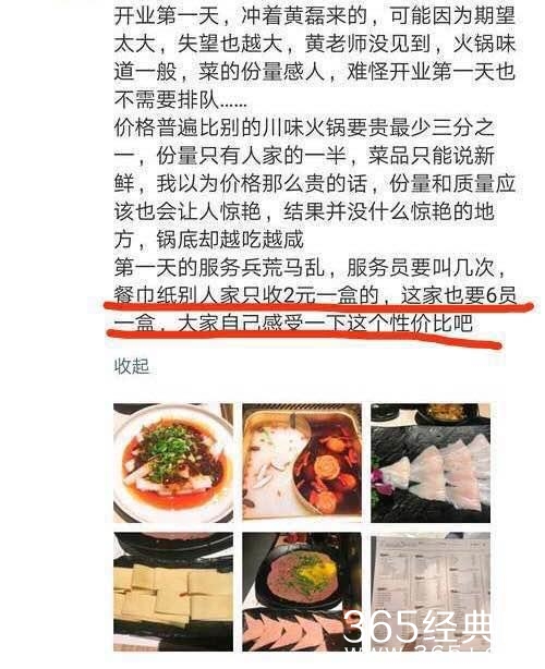 更有在第一天就因为黄磊慕名而去的消费者在某平台留言评价,不仅吃的东西贵,就连外面最多两元一包的纸巾在店里要6元一包,菜的分量也是十分感人味道也很一般般,就算是服务员也得叫上好几遍……
