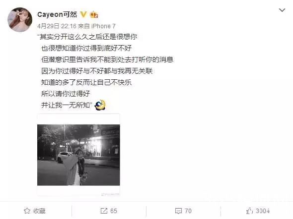 在焦可然的微博里妖姐发现,4月份的时候,她还沉浸在上一段感情中无法自拔的样子