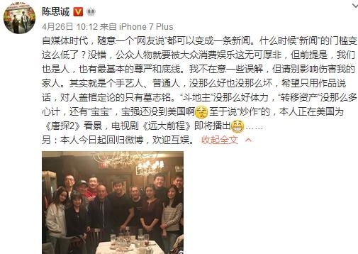 但是,家庭回归之后的鼓励让陈思诚更加有勇气了,批评,谩骂他已经不会在意,早在上个月他就绯闻事件一一澄清,并霸气宣示:本人今日起回归微博,欢迎互娱。