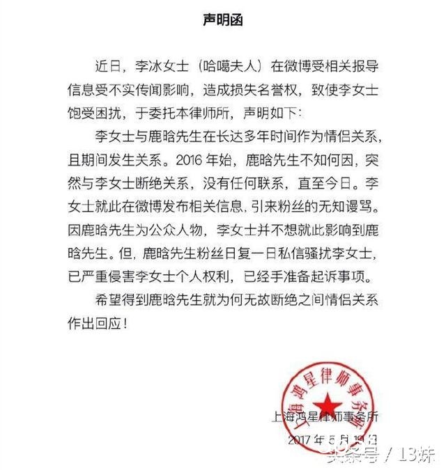 在声明函中详细阐述了自己和鹿晗的经过,还有律师事务所公章,看着真的假不了。本名叫李冰,和鹿晗有着多年的情侣关系,但是近年来对其不理睬,还遭受到鹿晗粉丝的谩骂和攻击,只想对鹿晗的无故消失索要个说法。